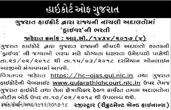 High Court of Gujarat Driver bharti 2018 (OJAS). Gujarat high Court Published Upcoming Driver Bharti News On news paper Advertisement. See More Updates and Details Like High Court of Gujarat Recruitment 2018 Application form, Age limit, Education Details etc are below.