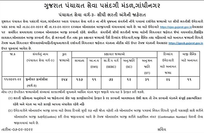 GPSSB Junior Pharmacist Bharti 2022 | GPSSB Junior Pharmacist Class III Recruitment 2022 | Recently Gujarat Panchayat Service Selection Board published New Govt Jobs official notification for various 254 Recruitment for Jr. Pharmacist Bharti 2022 at given below GPSSB Ojas Bharti Official website ojas.gujarat.gov.in. See Full Details like Application form, Age limit, Education, Fees, Pay scale are below.
