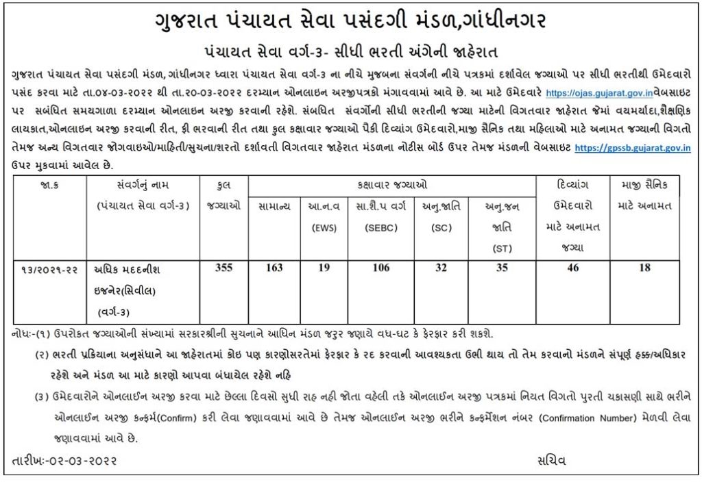 GPSSB 355 Additional Assistant Engineer Bharti 2022: It is a good opportunity for all the interested candidates who are looking for jobs in Gujarat Panchayat Service Selection Board, GPSSB. Gujarat Panchayat Service Selection Board (GPSSB) published New Jobs official notification for various 355 Recruitment for Additional Assistant Engineer (Civil) AAE Bharti 2022 at given below Like Application form, Age limit, Education, Fees, Pay scale etc GPSSB Ojas Bharti Official website ojas.gujarat.gov.in.