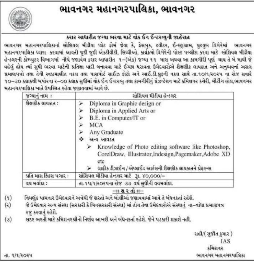 BMC Recruitment 2025 : BMC is inviting applications for the Social Media Handler position in 2025. Interested candidates can find details regarding age limit, educational qualifications, selection process, application fee, and how to apply on the official recruitment pages. The Bhavnagar Municipal Corporation is currently conducting recruitment for various positions in 2025. For specific details regarding available posts, eligibility criteria, application procedures, and deadlines, you can visit the official recruitment page or check local job portals for the latest updates.