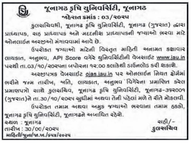 This bharti emphasizes innovation in areas like climate-resilient crops, dairy technology, and agro-processing. Selected candidates will contribute to JAU’s mission of farmer empowerment and contribute to Gujarat’s vision of doubling farmers’ income by 2025.