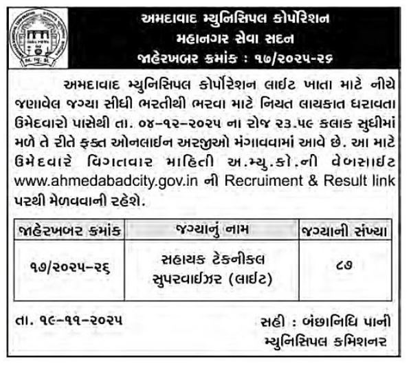 AMC Assistant Technical Supervisor Bharti 2025: Are you looking for government job opportunities in Ahmedabad? The Ahmedabad Municipal Corporation (AMC) has announced the recruitment for Assistant Technical Supervisor positions in 2025. With 87 vacancies available, this is a golden chance for eligible candidates to secure a stable career in municipal services. In this detailed post, we’ll cover everything you need to know about the AMC Assistant Technical Supervisor Bharti 2025, including eligibility, application process, important dates, and how to apply online. Let’s dive in!