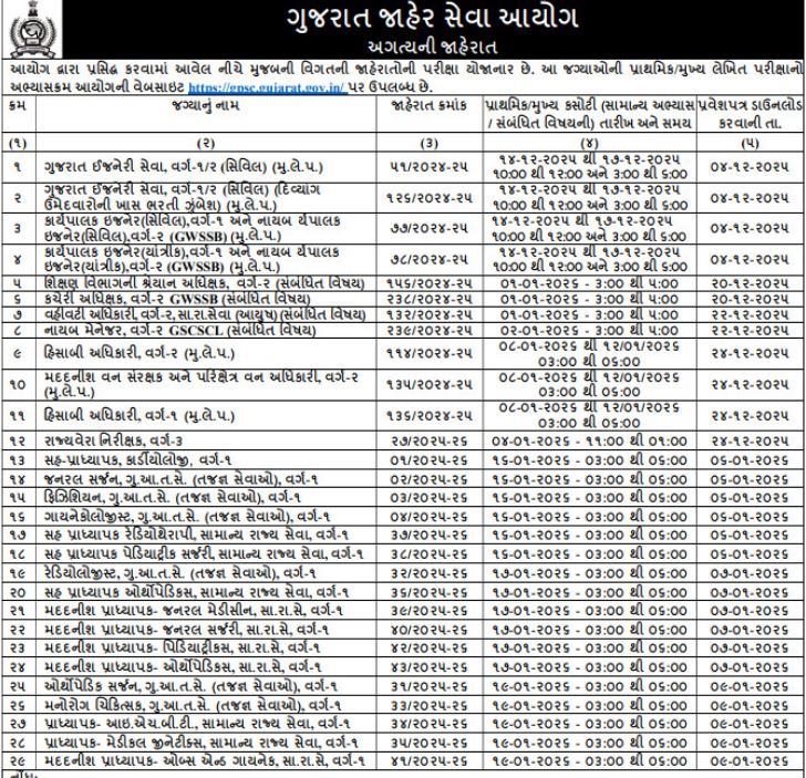 Syllabus includes Gujarati language, mental ability, and post-specific topics. Download the full syllabus from the GPSC website.