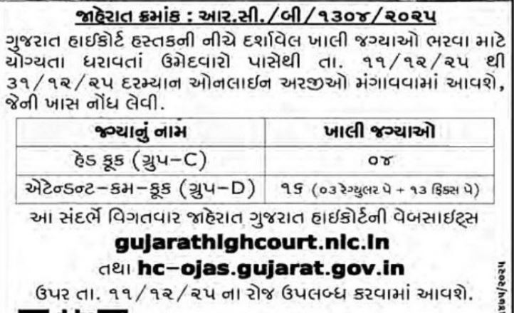 Gujarat High Court Bharti 2025: The High Court of Gujarat (HCG) has announced a significant recruitment drive for the posts of Head Cook (Group-C) and Attendant-cum-Cook (Group-D). Interested and eligible candidates are invited to apply online through the official HC-OJAS portal. This is an excellent opportunity for job seekers with the requisite skills and experience in cooking and catering to secure a position in the esteemed High Court establishment.