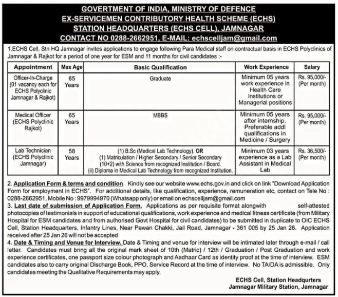 ECHS Jamnagar Bharti 2026: The Ex-Servicemen Contributory Health Scheme (ECHS), Station Headquarters Jamnagar, has officially invited applications for various contractual positions for the year 2026. This recruitment is open for both Ex-Servicemen (ESM) and Civilian candidates to serve in ECHS Polyclinics located in Jamnagar and Rajkot.